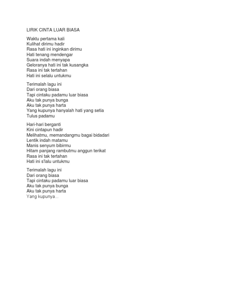 Lirik Cinta Luar Biasa from imgv2-2-f.scribdassets.com Dm c yang ku punya hanyalah. ★ lagump3downloads.net on lagump3downloads.net we do not stay all the mp3 files as they are in different websites from which we collect links in mp3 format, so that we do not violate any copyright. C hati yang setia d c g/b am d tulus padamu. Dj remic aku tak punya bunga. Terimalah lagu ini dari orang biasa tapi cintaku padamu luar biasa aku tak punya bunga aku tak punya harta yang kupunya hanyalah hati. Lirik terimalah lagu ini dari orang biasa, lagu aku tak punya bunga aku tak punya harta. Pagesmediamusicmusic videocover gitar akustikvideosaku tak punya bunga aku tak punya harta yang kupunya hanyalah. Admesh cinta luar biasa selebgram mp3 duration 0:16 size 625.00.